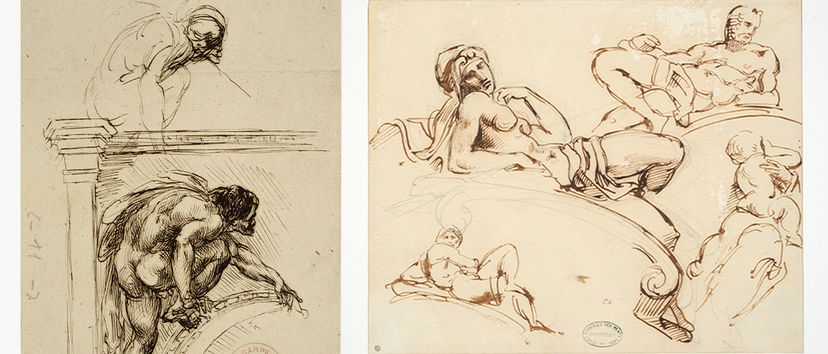 Crédits visuels : Jean-Baptiste Carpeaux, Étude d'après un détail du plafond de la Chapelle Sixtine de Michel-Ange, XIXe siècle, plume et encre brune sur papier, 11,5 x 18,7 cm © Beaux-Arts de Paris / Théodore Géricault, Étude d'après les figures des tombeaux des Médicis de Michel-Ange, mine de plomb et plume, encre brune sur papier beige, 23 x 28,1 cm © Beaux-Arts de Paris